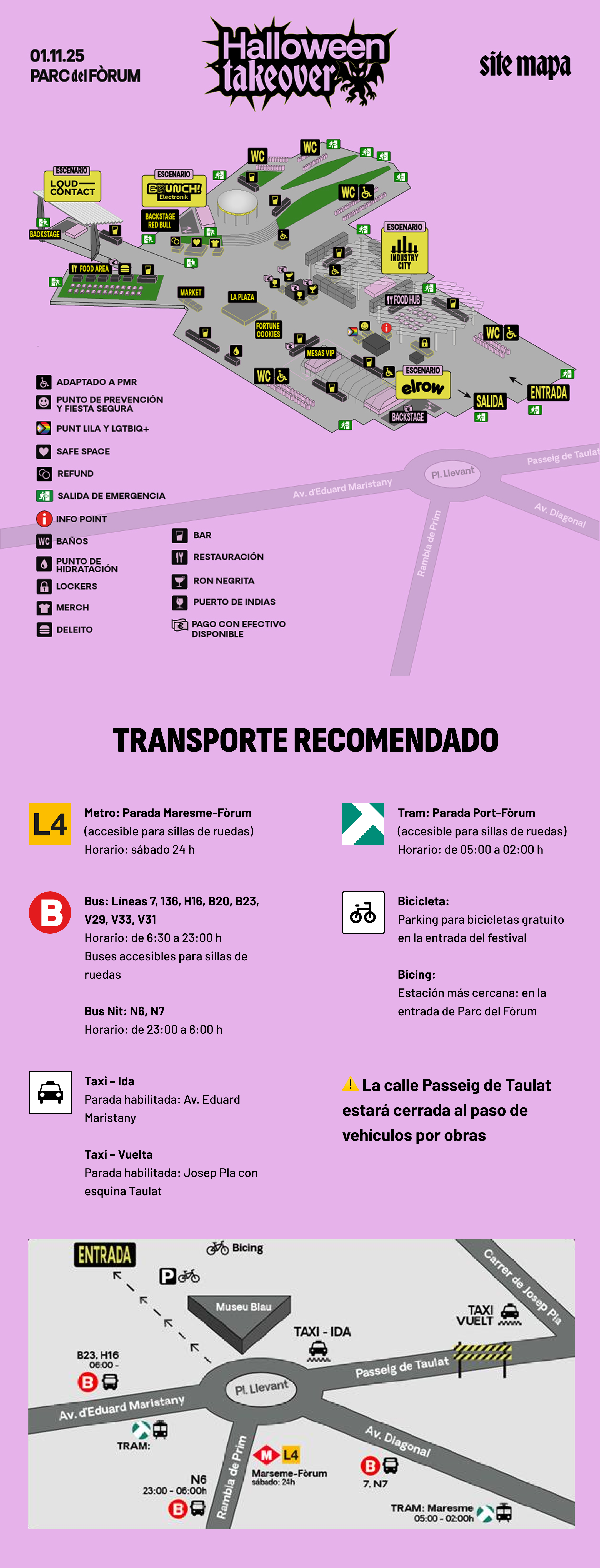 Halloween takeover se celebra el sábado 1 de noviembre de 2025, desde las 15:00h hasta las 03:00h del domingo 2 de noviembre. La hora límite de entrada es a las 01:30h.